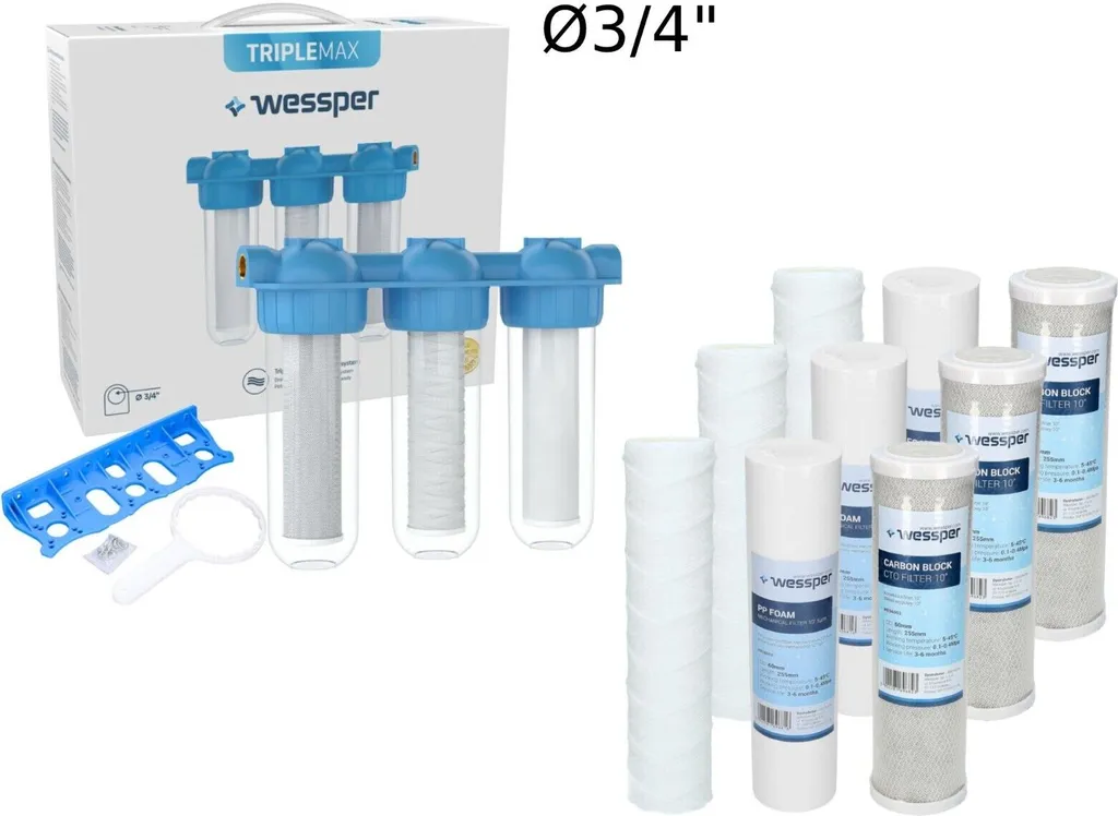 Wessper TripleMax ist 3-stufiges Vorfiltersystem für Sedimente, Pestizide, Chlor und andere Verunreinigungen. Geeignet für Brauchwasser, Regenwasser, Garten- und Brunnenwasser.
