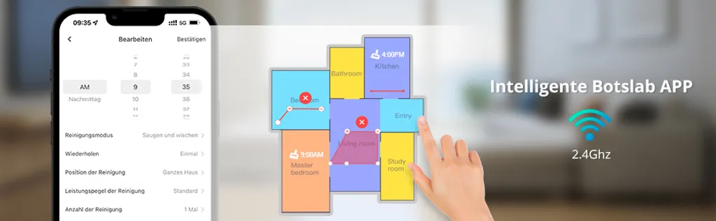 【BOTSLAB Smart APP & Sprachsteuerung】Botslab App ermöglicht es Ihnen, Ihren Roboter überall und jederzeit zu steuern. Sie können eine Echtzeitanzeige des Verbrauchsmaterialstatus finden, No-Go-Zonen einrichten, eine geplante Reinigung für verschiedene Räume oder eine bestimmte Zone, bis zu 3 Karten speichern und 5 Grundrisse in letzter Zeit überprüfen, usw. Der WLAN Staubsauger Roboter ist mit Alexa und Google Assistant kompatibel. (NUR mit 2,4G WLAN kompatibel)