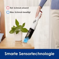 - LED-Arbeitslicht: Integrierte LEDs in der Bodendüse leuchten den Saugbereich optimal aus