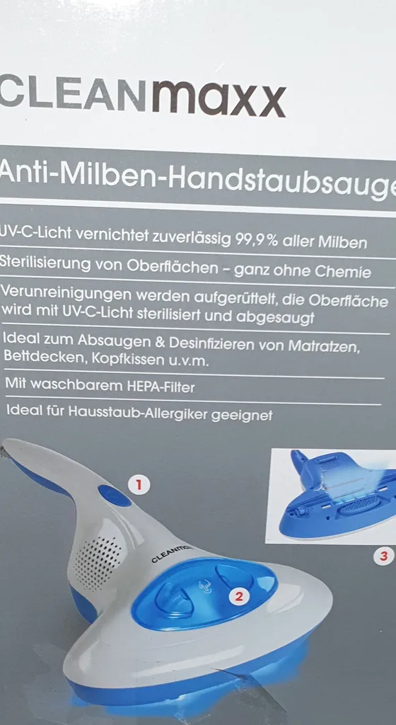 CLEANmaxx Antimilben-Handstaubsauger mit UV-C-Licht – Reinigen und Desinfizieren in einem Arbeitsgang. Zum kraftvollen Absaugen von Matratzen, Bettdecken, Kopfkissen, Polstergarnituren u.v.m. Die Verunreinigungen werden aufgerüttelt, die Oberfläche mit UV-C-Licht sterilisiert und dann abgesaugt. Das UV-C-Licht vernichtet zuverlässig 99,9 % aller Milben in wenigen Sekunden – ganz ohne Chemie. Mehr Sauberkeit für einen gesunden und ruhigen Schlaf. Mit waschbarem HEPA-Filter – ideal für Allergiker. Leicht entnehmbarer Schmutzbehälter. UV-C-Lampe und Bürsten abnehmbar. Kabellänge ca. 4,5 Meter. 300 Watt. Gehäuse aus ABS-Kunststoff. Gerätemaße LxBxH ca.: 32 x 28 x 11 cm.