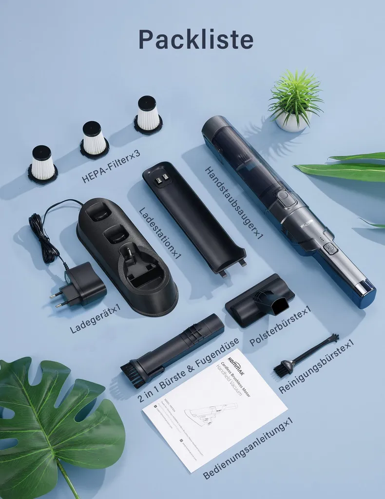 Abnehmbare Teile: Waschbarer HEPA-Filter, Polsterbürste, 2 in 1 Bürsten und Fugendüse