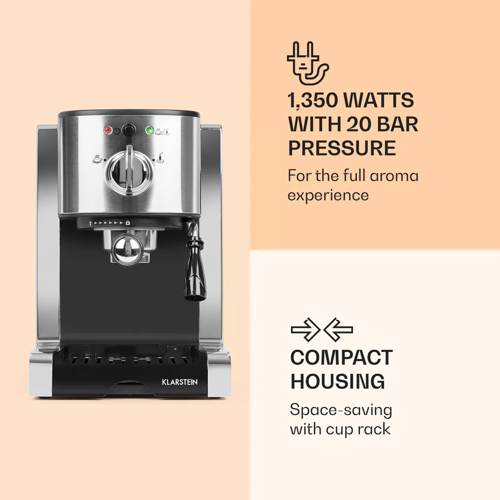 Stilvolles Design: Eleganz für die moderne Küche, 1.350 Watt mit 20 bar Druck: für das volle Aroma-Erlebnis , Kompaktes Gehäuse: platzsparend mit Tassenablage, Multifunktionale Dampfdüse: für Milchschaum und Heißgetränke , Einfache und übersichtliche Bedienung: via Drehknopf , 1,25 Liter Kapazität: für seltenes Nachfüllen , Mit dabei: Pulver-, Pad-Siebträger sowie Messlöffel