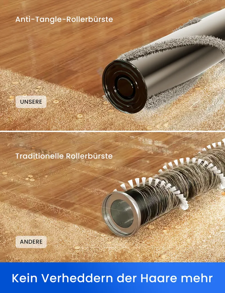 - 【Verbesserte Anti-Tangle-Rollenbürste】 Der bürstenlose Motor bietet eine starke Saugkraft für die motorisierte Rollenbürste, um Schmutz und Ablagerungen auf dem Boden effizient aufzunehmen. Die V-förmigen Führungsborsten arbeiten mit dem internen Kamm zusammen, um das Verheddern der Haare effektiv zu reduzieren und eine starke Leistung mit weniger Wartung zu liefern.