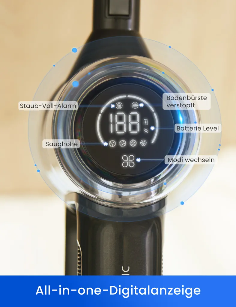 - 【All-in-One-Display und mühelose Bedienbarkeit】 Ein großer LED-Bildschirm zeigt den Batteriestand, den Saugmodus und Warnungen für festsitzende oder verstopfte Bürsten an. Mit der um 180° schwenkbaren Lenkung können Sie schwer zugängliche Stellen bequem aus jedem Winkel mit der LED-Scheinwerferbeleuchtung reinigen. Das einziehbare Vakuumrohr bietet eine einstellbare Länge für maximalen Komfort.