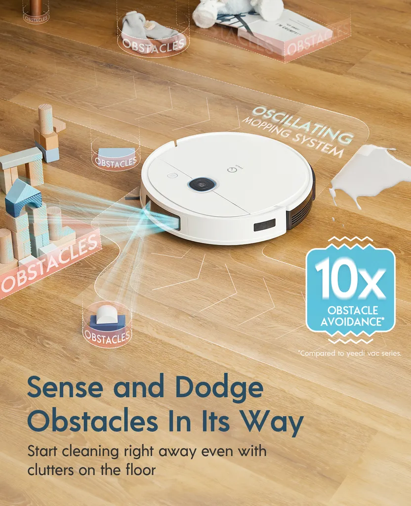 Mit der 3D-Hindernisvermeidungstechnologie erkennt yeedi, mit 10-facher Hindernisvermeidungspräzision (Im Vergleich zur Baureihe yeedi vac.), auf intelligente Weise Objekte, die ihm im Weg stehen, und reagiert rechtzeitig, um ihnen geschickt auszuweichen. Es ist nicht nötig, vor dem Putzen die täglichen Abfälle, Haustiernäpfe, Kinderspielzeug, Schuhe, auf dem Boden aufzusammeln.